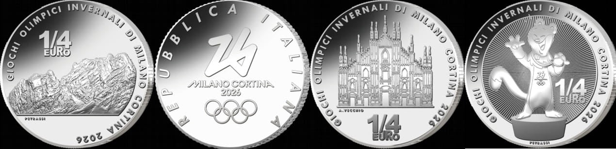 – wzdłuż krawędzi napis: GIOCHI OLIMPICI INVERNALI DI MILANO CORTINA 2026