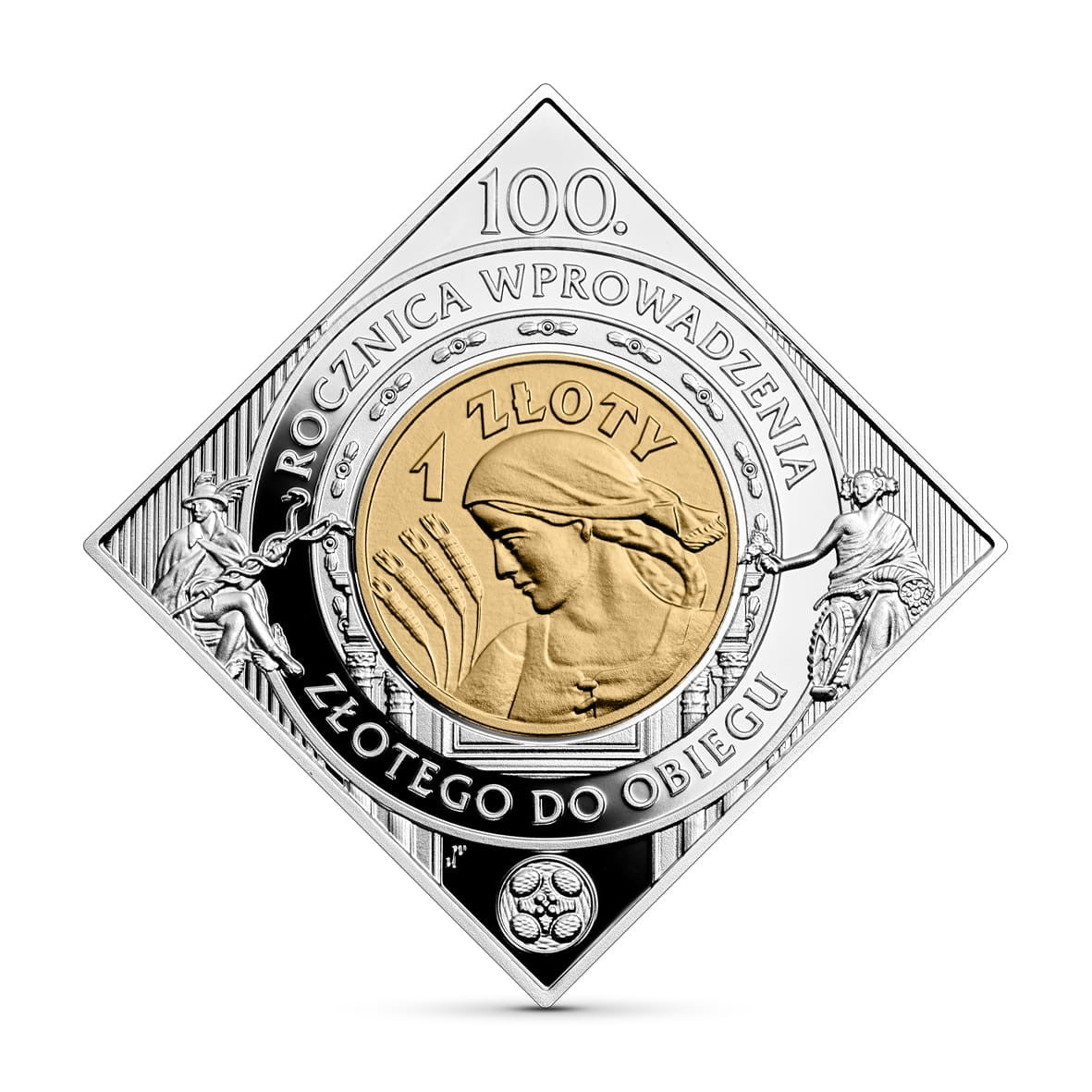 Centralnie stylizowany rewers monety o nominale 1 złoty z 1924 r. z wizerunkiem popiersia kobiety i kłosów oraz napisem: 1 ZŁOTY. Wokół wizerunku rewersu monety półkolem napisy: ROCZNICA WPROWADZENIA, ZŁOTEGO DO OBIEGU; w tle fragment portalu nad wejściem do głównej sali operacyjnej w dawnej siedzibie Banku Polskiego SA przy ulicy Bielańskiej w Warszawie. W górnym rogu liczba: 100, zakończona kropką. Z lewej i prawej strony w rogu, na tle pionowych linii: alegoria handlu w postaci rzymskiego boga Merkurego z kaduceuszem i alegoria przemysłu w postaci kobiety z rogiem obfitości, młotem i kołem zębatym, w dolnym rogu okrąg wypełniony ozdobnymi elementami – detale wzorowane na elementach graficznych banknotu o nominale 100 zł z 1934 r.