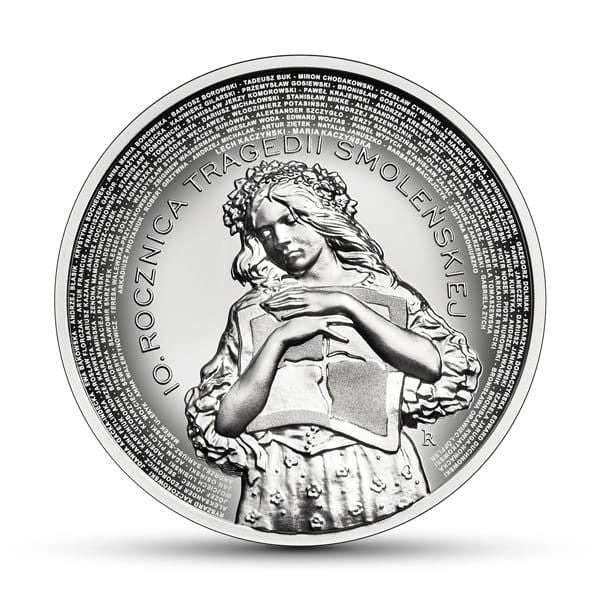 Na rewersie monety srebrnej widnieje personifikacja Polski - postać kobiety obejmującej odkształcony znak Sił Powietrznych RP, tworzący w centralnej części znak krzyża. U góry umieszczone zostały imiona i nazwiska osób, które zginęły w katastrofie samolotu w dniu 10 kwietnia 2010 r.