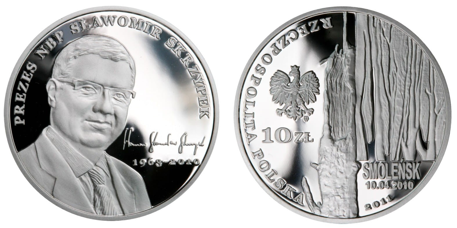 Awers: Awers: Centralnie, stylizowany fragment złamanego pnia drzewa. Po prawej stronie stylizowane fragmenty drzew. U dołu napis: SMOLEŃSK/10.04.2010. Poniżej półkolem oznaczenie roku emisji: 2011. Po lewej stronie wizerunek orła ustalony dla godła Rzeczypospolitej Polskiej. Pod orłem napis: 10 ZŁ. Z lewej strony orła półkolem napis: RZECZPOSPOLITA POLSKA. Pod lewą łapą orła znak mennicy: M/W