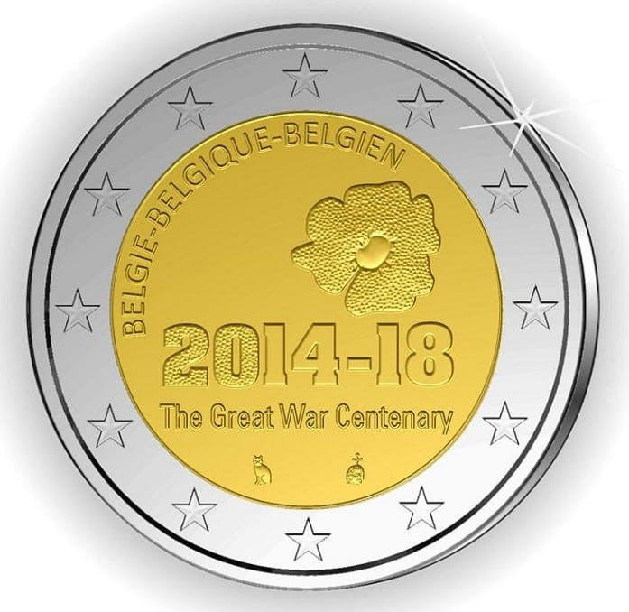 Opis: Wewnętrzna część monety przedstawia kwiat maku polnego. Pod nim umieszczono oznaczenie lat „2014–2018”. Poniżej widnieje napis „The Great War Centenary” (100. rocznica Wielkiej Wojny), pod którym znajdują się znak mincmistrza i znak mennicy brukselskiej – głowa archanioła Michała w hełmie. Wzdłuż górnej krawędzi biegnie nazwa kraju w trzech językach „BELGIE – BELGIQUE – BELGIEN”. W otoku monety widnieje 12 gwiazd Unii Europejskiej.
