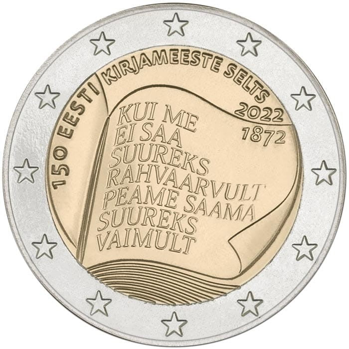 Opis: Motywem monety są strony książki i końcówka pióra. Na górze znajdują się półkolisty napis „EESTI KIRJAMEESTE SELTS” oraz rok emisji „2022”. Na stronach książki umieszczono słowa „KUI ME EI SAA SUUREKS RAHVAARVULT, PEAME SAAMA SUUREKS VAIMULT”, które w języku estońskim znaczą: „Jeśli nie jesteśmy narodem o wielkiej liczebności, musimy być wielcy duchem”. W otoku monety widnieje 12 gwiazd z flagi Unii Europejskiej.