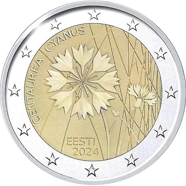 Opis: Moneta przedstawia kształt chabra bławatka, nad którym po lewej stronie biegnie półkoliście jego łacińska nazwa „CENTAUREA CYANUS”. Na dole znajduje się nazwa kraju emisji „EESTI”, a poniżej – rok emisji „2024”. W otoku monety widnieje 12 gwiazd z flagi Unii Europejskiej.