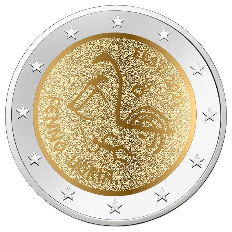 Opis: Projekt narodowej strony monety opiera się na rysunkach naskalnych z okolic jeziora Onega. Symbole przedstawiające myśliwego, łosia, ptaka wodnego i słońce tworzą symboliczny krąg życia ludów ugrofińskich. Centralne miejsce zajmuje ptak wodny, ponieważ ptaki wodne są reprezentowane w sztuce i folklorze wszystkich ludów ugrofińskich. W prawej górnej części biegnie półkoliście nazwa kraju „EESTI”, a za nią – rok „2021”. W lewej dolnej części znajduje się napis „FENNOUGRIA”. W otoku monety widnieje 12 gwiazd z flagi Unii Europejskiej.