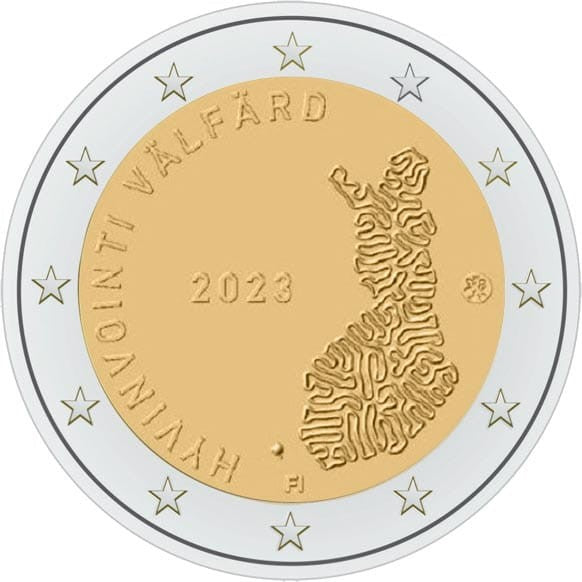 Opis: Moneta przedstawia stylizowaną mapę Finlandii. Po lewej stronie biegnie napis „DOBROSTAN” w językach fińskim i szwedzkim. Pośrodku nieco po lewej stronie umieszczono rok emisji „2023”. Na dole znajduje się oznaczenie kraju emisji „FI”, a po prawej stronie – znak mennicy fińskiej. W otoku monety widnieje 12 gwiazd z flagi Unii Europejskiej.