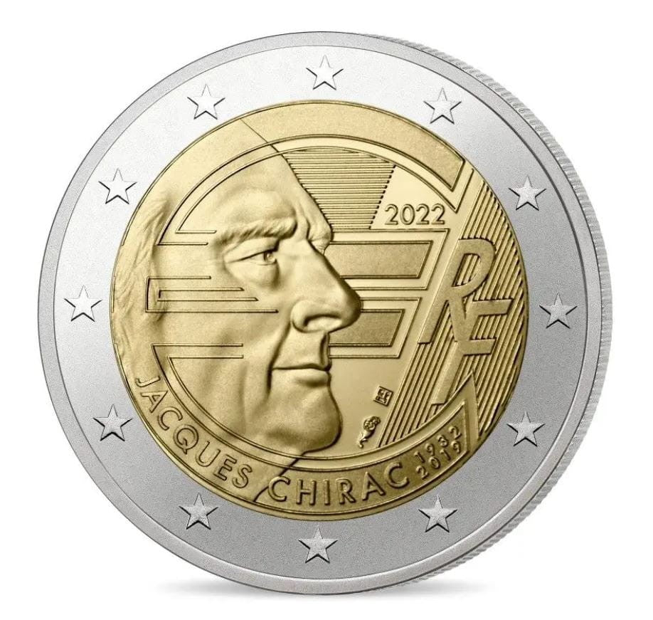 Opis: Jacques Chirac, który przez dwie kadencje piastował urząd prezydenta Republiki Francuskiej, był także jednym z głównych architektów projektu europejskiego. Sprawował funkcję prezydenta również w 2002, gdy wprowadzono euro, którego dwudziestolecie obchodzono na początku bieżącego roku. Moneta przedstawia profil Jacques’a Chiraca patrzącego z powagą w przyszłość. Portret jest otoczony symbolami reprezentującymi działania prezydenta: znakiem euro, który nawiązuje do jego zaangażowania we wprowadzenie wspólnej waluty i do jego proeuropejskiego nastawienia, oraz francuską flagą, przedstawioną w kolorach heraldycznych i opatrzoną literami „RF”, będącą odniesieniem do jego prezydentury. Na dolnym ramieniu symbolu euro zapisano imię i nazwisko oraz lata życia prezydenta. Motyw zawiera również znaki mennicy oraz datę roczną. W otoku monety widnieje 12 gwiazd z flagi Unii Europejskiej.