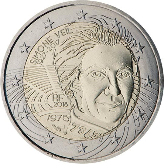 Opis: Na monecie widnieje portret Simone Veil, uosabiającej walkę o prawa kobiet. Simone Veil, z domu Jacob, zmarła w czerwcu 2017 w wieku 89 lat. Veil przeżyła Auschwitz, a następnie stała się jedną z najważniejszych postaci w procesie budowy nowej Europy. W latach 1979–1982 była przewodniczącą Parlamentu Europejskiego – pierwszego wybranego w wyborach powszechnych. Walczyła o depenalizację aborcji; prawo o dopuszczalności przerywania ciąży uchwalone w 1975 nazwano „ustawą Veil”. W 2008 została członkinią Akademii Francuskiej. Na monecie ukazany jest wizerunek Veil z numerem obozowym na kołnierzyku. W tle widać Parlament Europejski oraz jej imię i nazwisko, ważne daty, oznaczenie kraju „RF”, rok emisji „2018” i znaki mennicze. W otoku monety widnieje 12 gwiazd Unii Europejskiej.