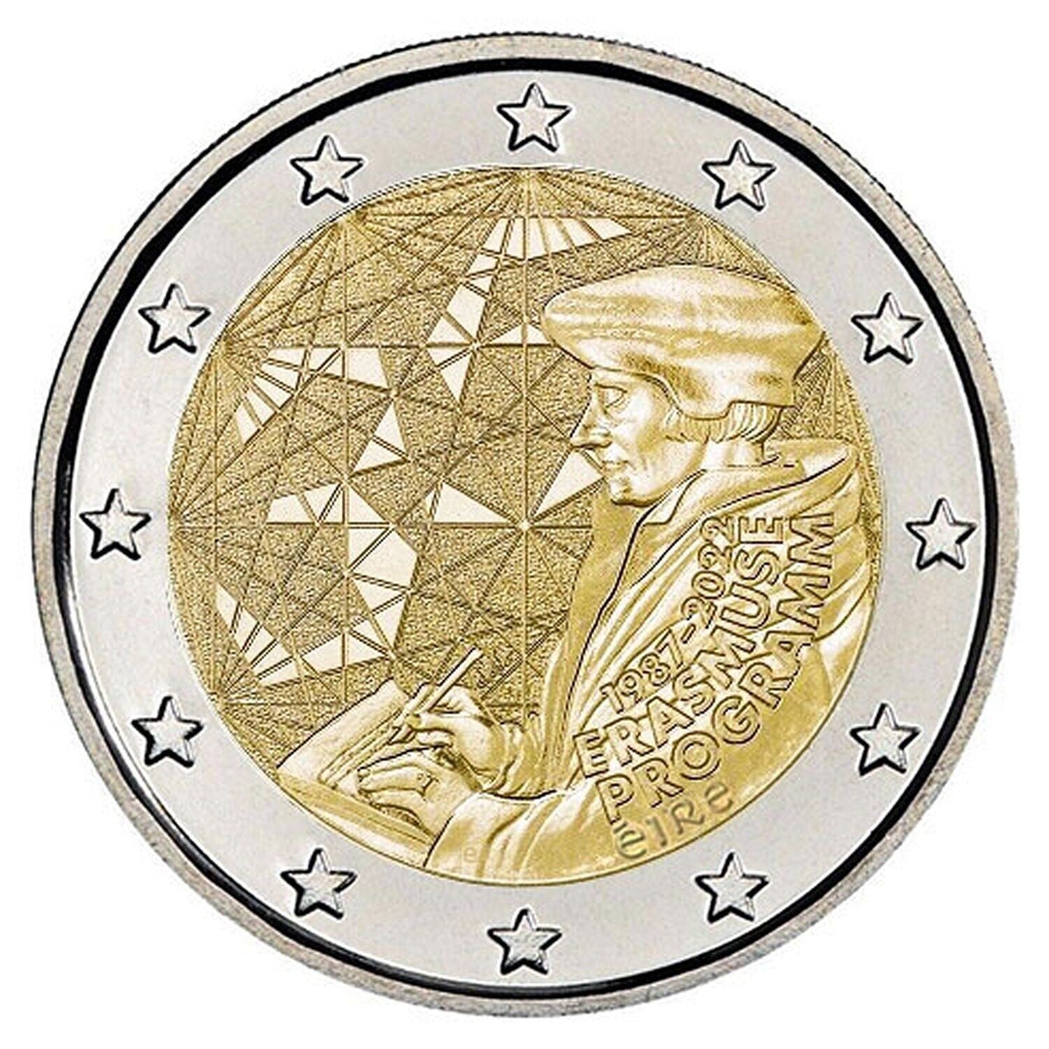 2 euro z 2022 r. poświęconą 35. rocznicy powstania programu Erasmus. Motyw monety przedstawia postać filozofa Erazma z Rotterdamu podczas pisania. W tle liczne linie łączą się w różnych punktach symbolizujący liczne wymiany intelektualne i ludzkie między studentami europejskimi. Wśród tych linii pojawia się również liczba 35, przedstawiona w nowoczesnym stylu graficznym, symbolizująca trzydziestą piątą rocznicę programu Erasmus.