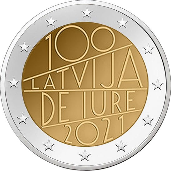 Opis: 26 stycznia 1921 łotewskim dyplomatom udało się doprowadzić do przełomowego wydarzenia – światowe mocarstwa uznały Łotwę de iure. Chociaż Łotwa ogłosiła niepodległość 18 listopada 1918, nowy naród uznano dopiero w 1920, po zakończeniu okresu walk i niepewności. Moneta przedstawia ozdobny napis „100 Latvija de iure 2021”, który zawiera nazwę kraju emisji (LATVIJA) oraz rok emisji (2021). W otoku monety widnieje 12 gwiazd z flagi Unii Europejskiej.