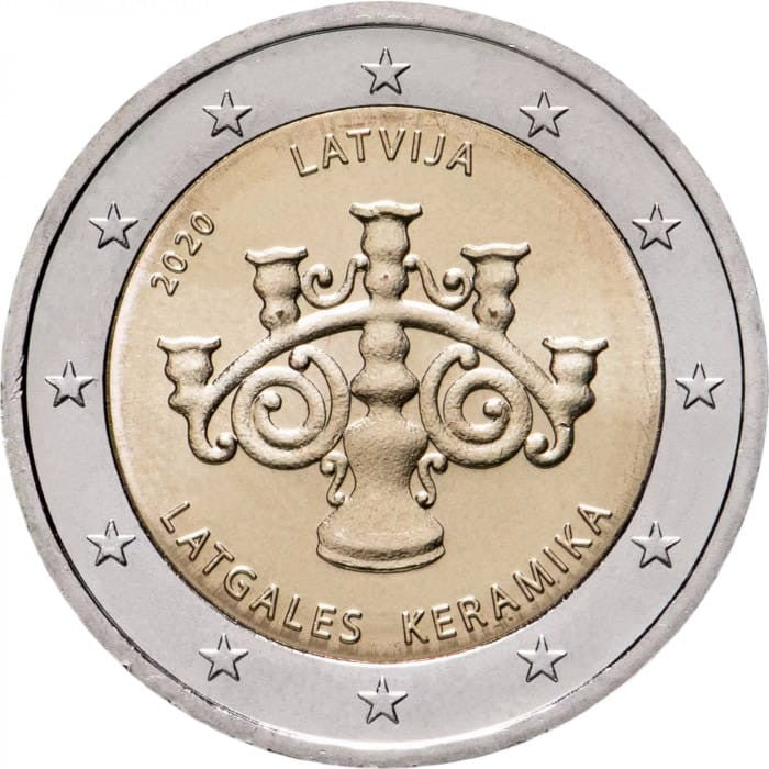 Opis: Moneta jest poświęcona garncarstwu łatgalskiemu. Tradycyjne garncarstwo przez długi czas było obecne w dwóch krainach – Łatgalii i Kurlandii, ale tylko w tej pierwszej przetrwało upływ czasu jako rzemiosło przekazywane z pokolenia na pokolenie. Garncarstwo łatgalskie należy również do kanonu kultury łotewskiej. Głównym motywem monety jest gliniany kandelabr, jako typowy przykład ceramiki łatgalskiej. Na dole widnieje napis „LATGALES KERAMIKA” (ceramika łatgalska), a na górze – nazwa kraju „LATVIJA” i rok emisji „2020”. W otoku monety widnieje 12 gwiazd z flagi Unii Europejskiej.