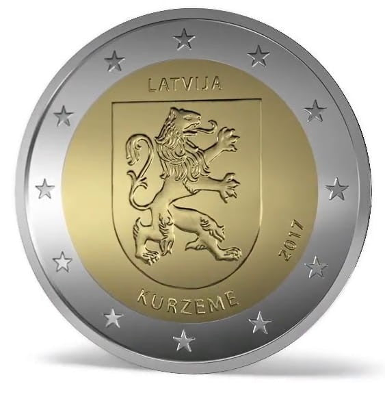 Opis: Motywem monety jest herb jednego z regionów Łotwy – Kurlandii (łot. Kurzeme). Nad herbem znajduje się nazwa kraju emisji „LATVIJA” (Łotwa), a pod nim – nazwa regionu „KURZEME”. Po prawej stronie umieszczono rok emisji „2017”. W otoku monety widnieje 12 gwiazd Unii Europejskiej.