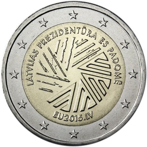 Opis: Moneta przedstawia oficjalne logo prezydencji łotewskiej. Dookoła biegnie napis „LATVIJAS PREZIDENTŪRA ES PADOMĒ” (Łotewska prezydencja Rady UE) i adres strony internetowej prezydencji „EU2015.LV”. W otoku monety widnieje 12 gwiazd Unii Europejskiej.