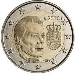 Opis: W środkowej części monety po lewej stronie widnieje portret wielkiego księcia Henryka (prawy półprofil). Obok herb książęcy, a nad nim rok emisji „2010” między znakami mennicy, zachodzące na otok monety. Pod wizerunkiem księcia umieszczono nazwę kraju-emitenta „LËTZEBUERG”, która także zachodzi na otok.
