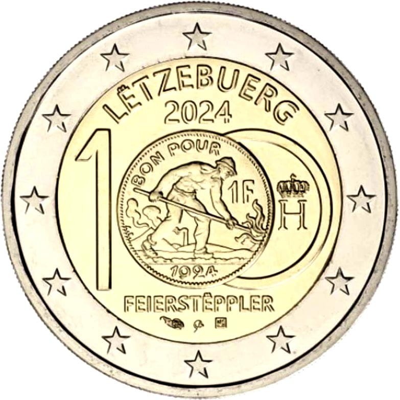 Opis: W środkowej części motywu przedstawiono luksemburską monetę wyemitowaną w 1924, ukazującą pracującego hutnika. Jej obraz wkomponowano w liczbę „100”, oznaczającą rocznicę pierwszej emisji jednej z najdłużej używanych monet franka luksemburskiego. W górnej części widać nazwę kraju emisji „LÉTZEBUERG” i rok „2024”. Na dole znajduje się słowo „FEIERSTËPPLER”, które jest powszechną i popularną nazwą upamiętnianej monety. Monogram (litera „H” w koronie) jest znakiem wielkiego księcia Henryka. Umiejscowiony znak mennicy może się zmienić, ponieważ nie wiadomo jeszcze, która mennica będzie bić monety. W otoku monety widnieje 12 gwiazd z flagi Unii Europejskiej.