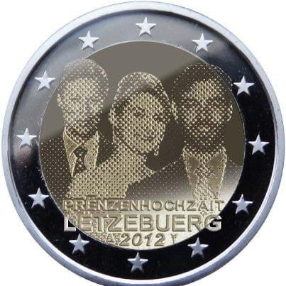 Opis: Po lewej stronie wewnętrznej części monety widnieje podobizna wielkiego księcia Henryka, a po prawej – wizerunek jego następcy, księcia Wilhelma, zachodzący na wizerunek hrabianki Stéphanie. Na dole części wewnętrznej znajduje się napis „PRËNZENHOCHZAÏT” (Ślub książęcy) i nazwa kraju „LËTZEBUERG”, a pod nimi – rok emisji „2012”, między znakiem mennicy a inicjałami mincmistrza. W otoku monety widnieje 12 gwiazd Unii Europejskiej.