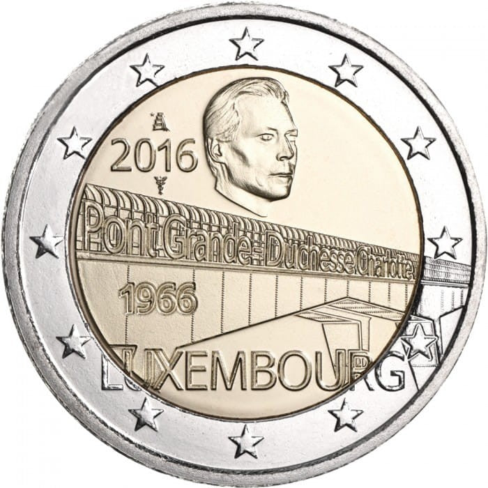 Opis: Motywem monety jest Most Wielkiej Księżnej Szarlotty – główne połączenie drogowe między centrum Luksemburga a dzielnicą Kirchberg, gdzie znajdują się siedziby instytucji Unii Europejskiej. Na wizerunku mostu umieszczono jego nazwę w języku francuskim „Pont Grande-Duchesse Charlotte”, a pod nią datę „1966”. Nad mostem widnieje portret wielkiego księcia Luksemburga Henryka, a z lewej strony portretu rok emisji „2016”. Na dole znajduje się nazwa kraju emisji „LUXEMBOURG”. W otoku monety widnieje 12 gwiazd Unii Europejskiej.