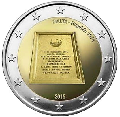 Opis: Jest to ostatnia z serii pięciu monet upamiętniających najważniejsze wydarzenia w konstytucyjnej historii Malty. 13 grudnia 1974 na Malcie proklamowano republikę. Wcześniej parlament zdecydowaną większością głosów uchwalił zmianę konstytucji. Głównym motywem jest marmurowa tablica z fasady pałacu prezydenckiego w Valletcie, upamiętniająca przekształcenie monarchii w republikę. Górą po prawej stronie biegnie półkoliście napis „MALTA – Republic 1974”. Na dole umieszczono rok emisji monety „2015”. W otoku monety widnieje 12 gwiazd Unii Europejskiej.