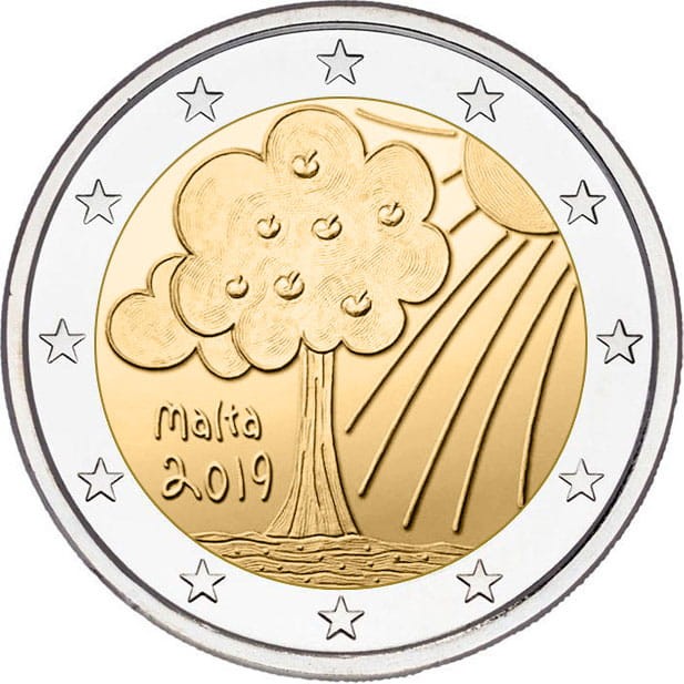 Opis: Autorem projektu monety jest uczeń, a jej główny motyw to drzewo owocowe i stylizowane słońce. W lewej dolnej ćwiartce widnieje nazwa kraju emisji „Malta”, a pod nią – rok emisji „2019”. W otoku monety widnieje 12 gwiazd z flagi Unii Europejskiej.