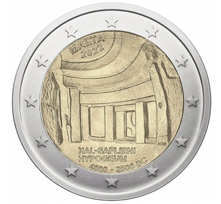 Opis: Motywem monety jest element prehistorycznego obiektu. W lewej górnej części znajdują się nazwa kraju emisji „MALTA” oraz, poniżej, rok emisji „2022”. Na dole umieszczono napis „ĦAL – SAFLIENI HYPOGEUM”, a pod nim lata „4 000–2 500 BC”. W prawej dolnej części widać inicjały autora motywu Noela Galei Basona „NGB”. W otoku monety widnieje 12 gwiazd z flagi Unii Europejskiej.