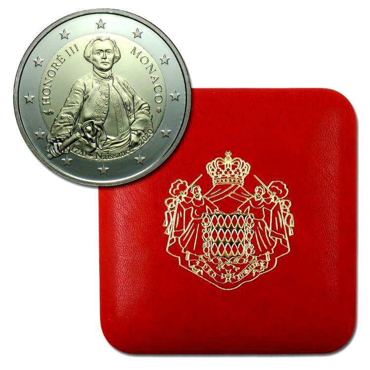 Opis: Głównym motywem monety jest wizerunek księcia Honoriusza III. Przy otoku po lewej stronie znajduje się imię księcia „HONORÉ III”, po prawej – nazwa państwa emitującego „MONACO”, a dołem biegnie półkoliście napis „1720 – Naissance – 2020” (1720 – urodziny – 2020). W otoku monety widnieje 12 gwiazd z flagi Unii Europejskiej.