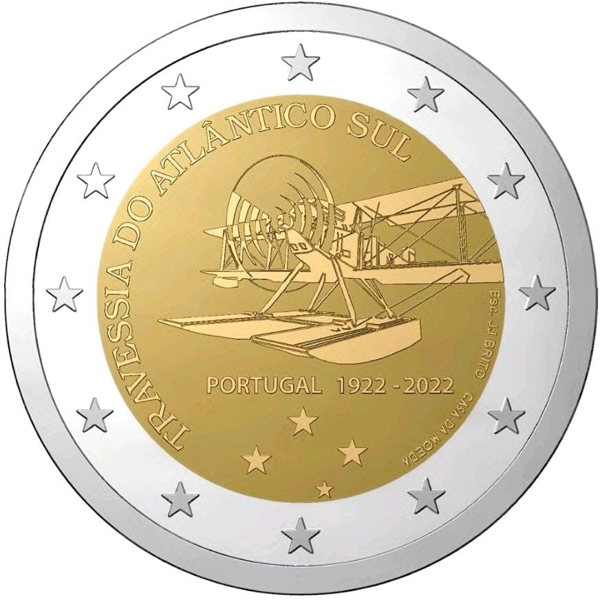 Opis: Przelot odbył się wyłącznie przy użyciu pokładowych urządzeń nawigacyjnych, czyli zmodyfikowanego sekstantu i sztucznego horyzontu. Motywem monety jest jeden z trzech dwupłatowców Fairey III, które wykorzystano do przelotu między Lizboną a Rio de Janeiro. Przy wewnętrznej krawędzi otoku biegną słowa „TRAVESSIA DO ATLÂNTICO SUL” (PRZELOT NAD POŁUDNIOWYM ATLANTYKIEM). Pod rysunkiem samolotu znajduje się napis „PORTUGAL 1922–2022”. Znakiem mennicy jest jej portugalska nazwa „CASA DA MOEDA”. W otoku monety widnieje 12 gwiazd z flagi Unii Europejskiej.