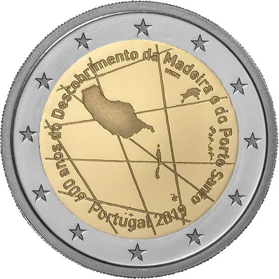 Opis: To wydarzenie, nazywane pierwszym portugalskim odkryciem geograficznym, było przełomem w ugruntowaniu pozycji Portugalii jako mocarstwa morskiego i zapoczątkowało epokę wielkich odkryć portugalskich (1418–1522). Głównym motywem monety jest archipelag Madery wraz z wyspą Porto Santo. Dookoła biegną półkoliście napisy „600 anos do Descobrimento da Madeira e do Porto Santo” (600-lecie okrycia Madery i Porto Santo) oraz „Portugal 2019”. W otoku monety widnieje 12 gwiazd z flagi Unii Europejskiej.