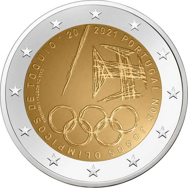 Opis: Moneta przedstawia stylizowane logo Portugalskiego Komitetu Olimpijskiego. Otacza je napis „Portugal nos Jogos Olímpicos de Tóquio’20 2021”.