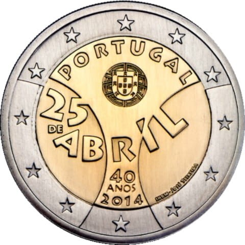 Opis: Dwa łuki układają się w kształt goździka – kwiatu, od którego wywodzi się nazwa rewolucji, przyjętego jako symbol przez ruch polityczny. W górnej części kwiatu wpisana jest nazwa kraju „PORTUGAL” i jego godło – astrolabium sferyczne. Pośrodku monety widnieje data przewrotu „25 DE ABRIL” (25 kwietnia), a poniżej liczba lat, jakie upłynęły od rewolucji – „40 ANOS” (40 lat), oraz rok emisji „2014”. Kształt liter i cyfr nawiązuje do plakatów i innych politycznych materiałów informacyjnych sprzed 40 lat, co ma symbolizować okres euforii, jaki nastał bezpośrednio po rewolucji. W otoku monety widnieje 12 gwiazd Unii Europejskiej.