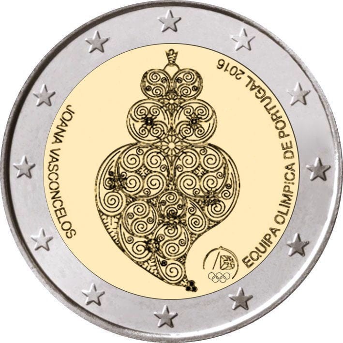 Opis: Główny motyw monety jest wzorowany na znanym dziele Joany Vasconcelos „Serce Viany”, inspirowanym tradycyjną biżuterią z regionu miasta Viana do Castelo w północnej Portugalii. Symbolizuje poparcie Portugalczyków dla narodowej reprezentacji olimpijskiej. Wzdłuż otoku po lewej stronie biegnie półkoliście napis „JOANA VASCONCELOS”, a po prawej „EQUIPA OLÍMPICA DE PORTUGAL 2016” (Reprezentacja olimpijska Portugalii 2016). Pod głównym motywem znajduje się znak mennicy „INCM”. W otoku monety widnieje 12 gwiazd Unii Europejskiej.