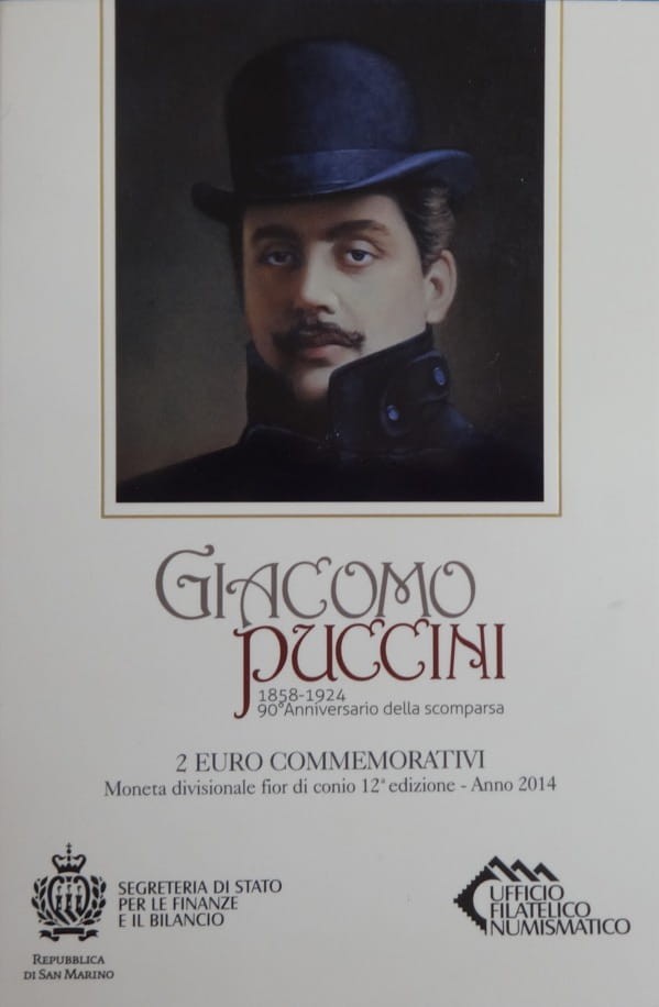 Moneta okolicznościowa 2 euro z San Marino z 2014 roku poświęcona 90 rocznicy śmierci Giacomo Pucciniego. Giacomo Puccini był włoskim kompozytorem urodzonym 22 grudnia 1858 r. W Lukce, zmarł 29 listopada 1924 r. W Brukseli. Napisał w sumie 12 oper. Jego najbardziej znane dzieła to opery "Manon Lescaut" i "La fanciulla del West".