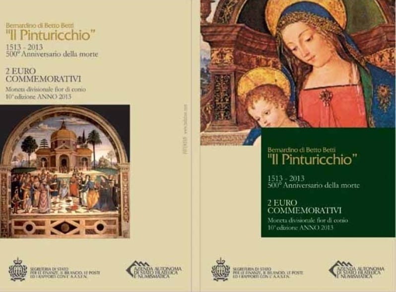 Opis: Na pierwszym planie znajduje się fresk „Rozmowa Jezusa z uczonymi w piśmie”. W dolnej części biegnie półkoliście nazwa kraju „SAN MARINO”, z lewej strony widać literę „R” – znak mennicy włoskiej, poniżej fresku umieszczono nazwisko projektantki „MOMONI”, zaś nad freskiem biegnie półkoliście napis „PINTURICCHIO”, pod którym wygrawerowano lata „1513” i „2013”. W otoku monety widnieje 12 gwiazd Unii Europejskiej.