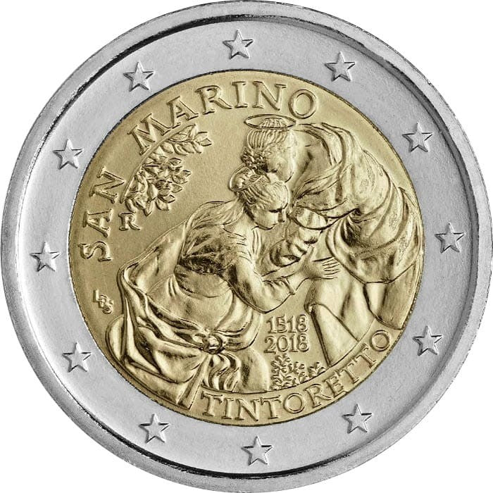 Opis: Centralnym motywem monety jest fragment obrazu Tintoretta „Nawiedzenie” (obejmujące się św. Maria Panna i św. Elżbieta); między nimi widnieją daty „1518–2018”. Przy otoku biegną półkoliście: na górze – nazwa kraju „SAN MARINO”, na dole – nazwisko „TINTORETTO”; między nimi po lewej stronie umieszczono monogram projektantki Luciany de Simoni „LDS” oraz znak mennicy rzymskiej „R”. W otoku monety widnieje 12 gwiazd Unii Europejskiej.