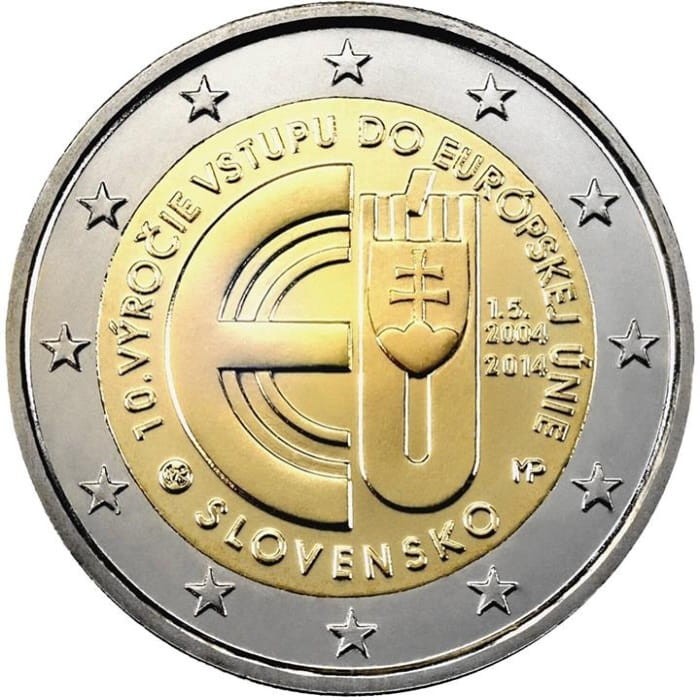 Opis: W środkowej części monety widnieją ozdobne litery „EÚ” (skrót słowackiej nazwy Unii Europejskiej), a na ich tle herb Republiki Słowackiej. Po prawej stronie umieszczono datę przystąpienia Słowacji do Unii Europejskiej „1.5.2004” (w dwóch wierszach), a bezpośrednio pod nią rok „2014”. Przy dolnej krawędzi części wewnętrznej znajduje się nazwa kraju „SLOVENSKO” (Słowacja), a wzdłuż górnej krawędzi biegnie półkoliście napis „10. VÝROČIE VSTUPU DO EURÓPSKEJ ÚNIE” (10. rocznica wejścia do Unii Europejskiej). Pod nim po lewej stronie widnieje znak mennicy w Kremnicy (litery „MK” między dwoma stemplami), a po prawej – monogram projektantki Márii Poldaufovej „MP”. W otoku monety widnieje 12 gwiazd Unii Europejskiej.