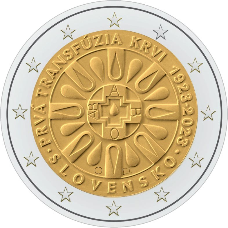 Opis: Na monecie przedstawiono krzyż równoramienny – międzynarodowy symbol pomocy medycznej, nadziei i człowieczeństwa. Na jego ramionach umieszczono oznaczenia czterech grup krwi: „A”, „B”, „0” oraz „AB”. Na krzyżu odciśnięte są jeszcze dwa krzyże równoramienne, jeden wewnątrz drugiego, a w środku motywu widoczna jest kropla krwi. Wokół głównego krzyża przedstawiono dolne części probówek. W próbówkach i między nimi są stylizowane odciski kropli krwi. Przy dolnej próbówce na prawo widać stylizowane inicjały projektantki Márii Poldaufovej „MP”, zaś po lewej stronie – znak mennicy w Kremnicy (Mincovňa Kremnica), składający się z liter „MK” między dwoma stemplami. Wewnętrzna część monety jest w większości otoczona napisem „PRVÁ TRANSFÚZIA KRVI 1923–2023” (PIERWSZA TRANSFUZJA KRWI 1923–2023). Na dole przy brzegu umieszczono nazwę kraju emisji „SLOVENSKO” oraz, po obu jej stronach, kropki oddzielające ją od napisu. W otoku monety widnieje 12 gwiazd z flagi Unii Europejskiej.