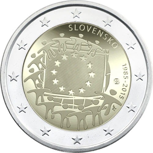 Opis: Moneta przedstawia unijną flagę jako symbol, który jednoczy ludzi i kultury wokół wizji i ideałów lepszej wspólnej przyszłości. Dwanaście gwiazd przechodzących w postaci ludzi okala narodziny nowej Europy. Górą po prawej stronie biegną po półokręgu nazwa kraju emisji i daty „1985–2015”, a niżej znajduje się monogram projektanta Georgiosa Stamatopoulosa. W otoku monety widnieje 12 gwiazd Unii Europejskiej.