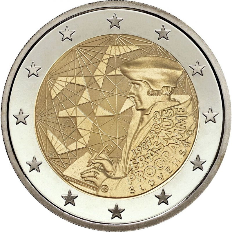 2 euro z 2022 r. poświęconą 35. rocznicy powstania programu Erasmus. Motyw monety przedstawia postać filozofa Erazma z Rotterdamu podczas pisania. W tle liczne linie łączą się w różnych punktach symbolizujący liczne wymiany intelektualne i ludzkie między studentami europejskimi. Wśród tych linii pojawia się również liczba 35, przedstawiona w nowoczesnym stylu graficznym, symbolizująca trzydziestą piątą rocznicę programu Erasmus.