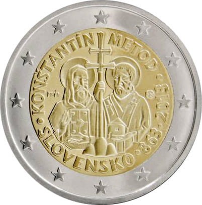 Opis: W wewnętrznej części monety ukazano braci Cyryla i Metodego z Salonik, stojących po obu stronach podwójnego krzyża na trójwzgórzu. Krzyż ten, przypominający także pastorał biskupi, symbolizuje jednocześnie państwowość i chrześcijaństwo oraz podkreśla znaczenie misji braci, którzy przyczynili się do uzyskania pełnej suwerenności i legitymizacji przez Wielkie Morawy, pierwsze państwo słowiańskie w Europie Środkowej. Cyryl ukazany jest z książką symbolizującą naukę i wiarę, a Metody trzyma miniaturę kościoła reprezentującą wiarę i zinstytucjonalizowane chrześcijaństwo. Wzdłuż dolnego brzegu wewnętrznej części monety biegnie nazwa państwa emitującego „SLOVENSKO” oraz lata „863–2013”. Przy górnym brzegu znajdują się imiona braci „KONŠTANTÍN” i „METOD”. Po lewej stronie wizerunków braci widać stylizowane litery „mh” (inicjały projektanta monety Miroslava Hrica), zaś po prawej – znak Mennicy w Kremnicy (litery „MK” między dwoma stemplami).