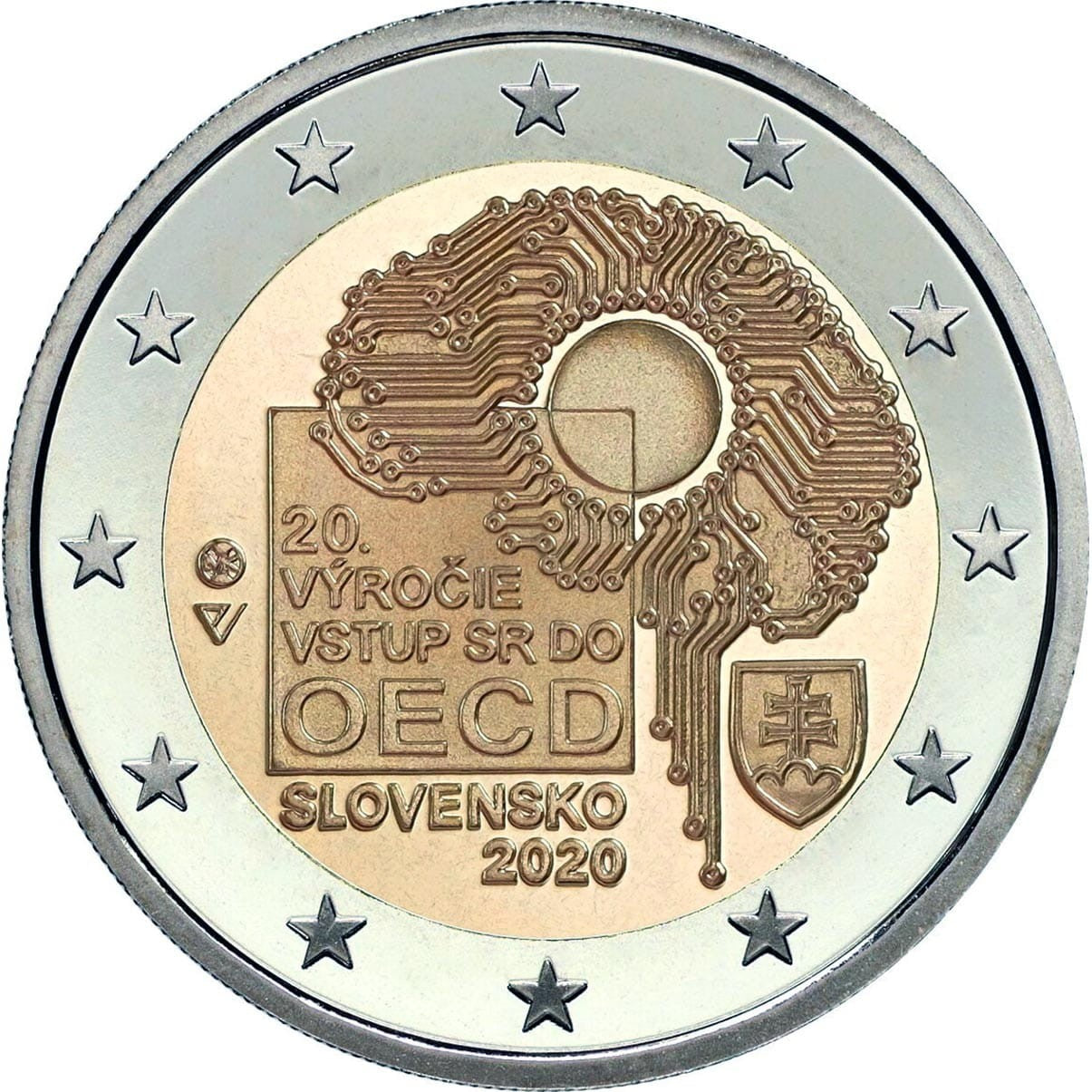 Opis: W górnej prawej części strony narodowej monety widnieje przedstawienie koncepcji cyfrowego humanizmu: obwody drukowane w kształcie ludzkiego mózgu, a w jego środku okrąg przedstawiający mikroprocesor. Słowackie godło umieszczone jest obok dolnego brzegu po prawej stronie. Na główny rysunek częściowo nakłada się wpisany w kontur kwadratu napis „20. VÝROČIE” oraz „VSTUP SR DO OECD” (20 rocznica przystąpienia Słowacji do OECD). Poniżej kwadratu znajdują się nazwa państwa emitującego „SLOVENSKO” oraz rok emisji „2020”, jedno pod drugim. Pomiędzy kwadratem a lewym brzegiem widnieje znak mennicy w Kremnicy (Mincovňa Kremnica), składający się z liter „MK” umieszczonych między dwoma stemplami. Poniżej znaku mennicy znajdują się stylizowane litery „PV” stanowiące inicjały projektanta Petera Valacha. W otoku monety widnieje 12 gwiazd z flagi Unii Europejskiej.