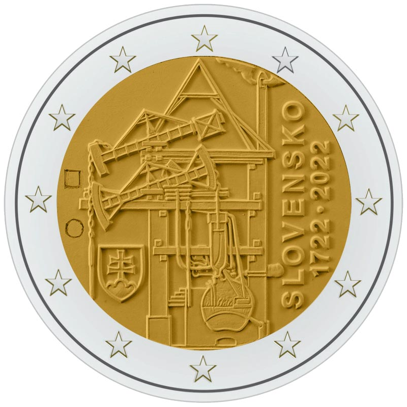 Opis: Na monecie przedstawiono atmosferyczny silnik parowy do napędu pomp odwadniających kopalnie, który skonstruowano w górniczym mieście Nová Baňa w 1722 jako pierwszy tego rodzaju silnik w Europie kontynentalnej. Został on zaprojektowany i zbudowany przez angielskiego inżyniera Isaaca Pottera, którego faksymile umieszczono w dwóch pionowych wierszach w lewej dolnej części motywu. W prawej części, również w dwóch pionowych wierszach, znajdują się nazwa kraju emisji „SLOVENSKO” oraz lata „1722” i „2022” oddzielone kropką środkową. Po lewej stronie przy otoku widać znak mennicy w Kremnicy (Mincovňa Kremnica) – litery „MK” między dwoma stemplami – oraz, poniżej, stylizowane inicjały projektanta narodowej strony monety Petera Valacha. W otoku monety widnieje 12 gwiazd z flagi Unii Europejskiej.