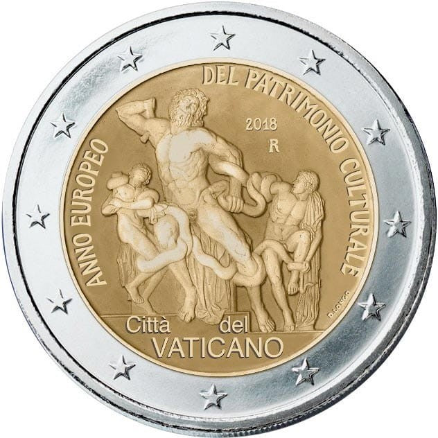 Opis: Motywem monety jest rzeźba zwana Grupą Laokoona, przedstawiająca mitycznego Laokoona i jego synów oplecionych przez węże. To wyjątkowo cenny eksponat w zbiorach Muzeów Watykańskich i jedno z najważniejszych dzieł światowej sztuki rzeźbiarskiej. W dolnej części monety centralnie umieszczono nazwę kraju emisji „Città del VATICANO” (Państwo Watykańskie). Przy otoku biegnie półkoliście napis „ANNO EUROPEO DEL PATRIMONIO CULTURALE” (Europejski Rok Dziedzictwa Kulturowego). Nad rzeźbą po prawej stronie umieszczono rok emisji „2018” i znak mennicy „R”. Niżej przy otoku znajduje się nazwisko projektantki „D. LONGO”. W otoku monety widnieje 12 gwiazd Unii Europejskiej.