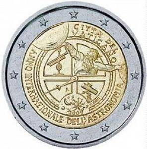 Opis: Wewnętrzna część monety przedstawia w sposób alegoryczny narodziny gwiazd i planet, jak również kilka instrumentów astronomicznych. Znak mennicy „R” znajduje się w dolnej lewej ćwiartce koła, rok wybicia monety „2009” umieszczono na dole. Wokół rysunku, na dole z lewej strony znajduje się napis „ANNO INTERNAZIONALE DELL’ASTRONOMIA”; na górze z prawej strony – oznaczenie państwa emitującego „CITTÁ DEL VATICANO”. Dwanaście gwiazd flagi europejskiej umieszczonych jest na zewnętrznym otoku monety.