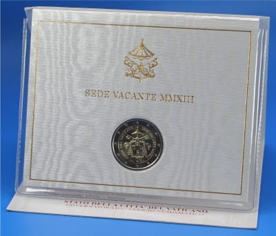 Opis: Na monecie przedstawiono herb kardynała kamerlinga z dwoma małymi krzyżami Kamery Apostolskiej. Powyżej po lewej stronie widnieje nazwa kraju „CITTÀ DEL VATICANO” (Państwo Watykańskie), a po prawej – napis „SEDE VACANTE MMXIII” (Przy nieobsadzonej stolicy 2013). W otoku monety widnieje 12 gwiazd Unii Europejskiej.