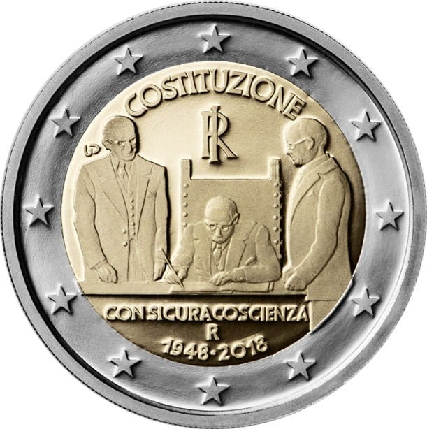 Opis: Enrico De Nicola, pełniący obowiązki głowy państwa, podpisuje 27 grudnia 1947 akt ogłoszenia konstytucji Republiki Włoskiej; po jego prawej stronie stoi szef rządu Alcide De Gasperi, a po lewej – Umberto Terracini, przewodniczący włoskiego Zgromadzenia Konstytucyjnego. Powyżej znajduje się napis „COSTITUZIONE” (Konstytucja) oraz monogram Republiki Włoskiej „RI”; w dolnym polu widnieją: napis „CON SICURA COSCIENZA” (Z czystym sumieniem), litera „R” będąca znakiem mennicy rzymskiej oraz daty „1948 • 2018” na oznaczenie, odpowiednio, roku wejścia w życie konstytucji i roku emisji monety. W otoku monety widnieje 12 gwiazd Unii Europejskiej.