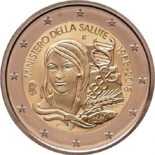 Opis: Motywem monety jest postać kobieca będąca alegorią zdrowia oraz nawiązujące do działalności ministerstwa symbole: środowiska naturalnego, prac badawczych, odżywiania i medycyny. Po lewej stronie widnieje monogram Republiki Włoskiej „RI”, nad nim – znak mennicy rzymskiej „R”, a pod wizerunkiem postaci kobiecej – monogram projektantki Silvii Petrassi. Górą od lewej do prawej biegną półkoliście: napis „MINISTERO DELLA SALUTE” (Ministerstwo zdrowia) i daty „1958–2018”. W otoku monety widnieje 12 gwiazd Unii Europejskiej.