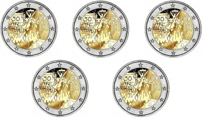 Opis: Trzydzieści lat temu upadł mur berliński. To wydarzenie nie tylko wpłynęło na społeczeństwo niemieckie, lecz także miało skutki globalne. Dzień 9 listopada 1989 jest uznawany za koniec zimnej wojny i zapowiedź ocieplenia stosunków międzynarodowych po kilkudziesięciu latach napięć. W Europie był to pierwszy krok w stronę zjednoczenia jednego z wiodących krajów Unii Europejskiej. Przypieczętował je tzw. traktat dwa plus cztery, którego sygnatariuszem była także Francja. W ciągu jednego roku Unia Europejska zyskała wtedy 16 milionów nowych obywateli, czego skutki strukturalne i gospodarcze były prawie takie, jak w przypadku przyjęcia nowego państwa członkowskiego. Motywem monety jest mur berliński; przez wyrwę pośrodku przelatują gołębie (alegoria międzynarodowego procesu pokojowego) i idzie świętujący tłum. W tle widać Bramę Brandenburską, najbardziej rozpoznawalną budowlę Berlina. Z boku na murze widnieje napis „30 Jahre Mauerfall” (30. rocznica upadku muru). Na dole przy otoku znajdują się oznaczenia roku i kraju emisji – „2019” i „D”. W otoku monety widnieje 12 gwiazd z flagi Unii Europejskiej.