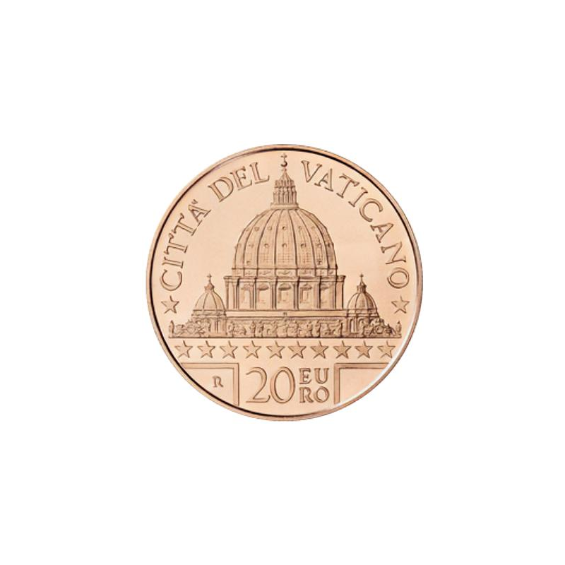 Motyw przestawia detal kopuły Bazyliki Świętego Piotra, dwie mniejsze kopuły oraz 13 posągów balustrady. Na monecie został wybity również napis CITTA' DEL VATICANO oraz nominał 20 EURO.