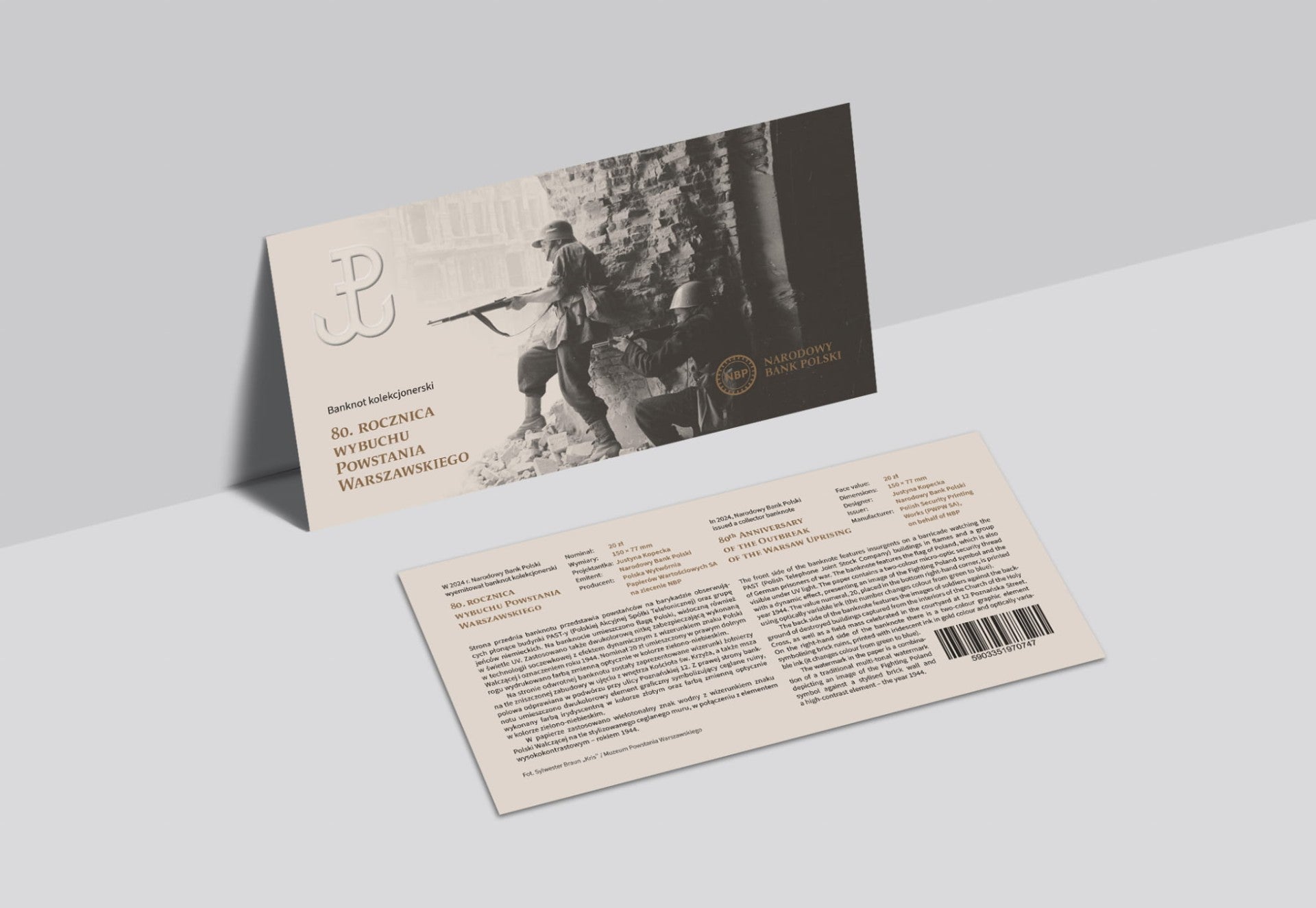 Przednia strona: W lewym górnym rogu nominał, na poziomym pasku, w pionie, obrócony o 900: 20. Wzdłuż lewej krawędzi seria i numer. W lewym dolnym rogu oznaczenie dla osób niedowidzących i niewidomych w postaci dwóch „XX”, obróconych o 900. Z prawej strony pole znaku wodnego. Z lewej strony pola, w pionie, obrócony o 900 nominał słowny i nazwa waluty: DWADZIEŚCIA ZŁOTYCH. W dolnej części pola znaku wodnego nominał liczbowy „20” z dynamicznym efektem zmiany koloru od zielonego do niebieskiego, z widocznym ceglanym murem. Pod nominałem seria i numer. Na lewo od słownego nominału i nazwy waluty pasek zabezpieczający. Na górnym pasku, pośrodku, wizerunek orła ustalony dla godła Rzeczypospolitej Polskiej oraz nazwa banku centralnego: Narodowy / Bank Polski. Na prawo od nazwy banku element recto-verso w postaci litery „W”, od wyrażenia „(…) godziny »W«.” w treści rozkazu bojowego rozpoczynającego powstanie. Na pasku mikrotekst: POWSTANIEWARSZAWSKIE1944 oraz geometryczne wzory. Poniżej paska, pod godłem, napis: WARSZAWA / 10 STYCZNIA 2024 r. Pod datą stanowisko: PREZES i faksymile oraz: GŁÓWNY / SKARBNIK i faksymile. Na dole pośrodku napis okolicznościowy: 80. ROCZNICA / WYBUCHU / POWSTANIA / WARSZAWSKIEGO. Na prawo od napisu stylizowana flaga Polski. W tle napisy: 1 VIII, 1944 oraz symbol Polski Walczącej.