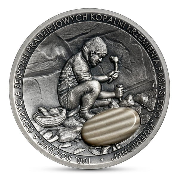 Centralnie wizerunek górnika z okresu pradziejowego pracującego w kopalni krzemienia pasiastego. Poniżej owalny element z krzemienia pasiastego. W otoku, na wyodrębnionej płaszczyźnie, od lewej strony ku górze, napis: 100. ROCZNICA ODKRYCIA ZESPOŁU PRADZIEJOWYCH KOPALNI KRZEMIENIA PASIASTEGO „KRZEMIONKI”, zakończony perełką.