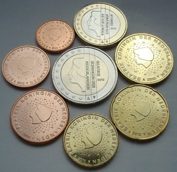 1 € i 2 €: monety przedstawiają profil królowej Beatrix i napis