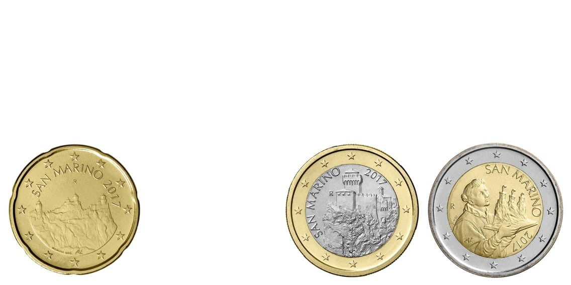 Druga seria: motywem monet 1, 2 i 5 centów są kolejno: herb Republiki San Marino, brama miejska i kościół św. Kwiryna.